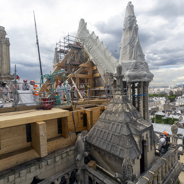 Enfin, pour garantir le suivi de ces travaux, des installations de chantier ont été réalisées, avec notamment la mise en place d’une clôture autour de la zone de chantier, l’aménagement d’une base-vie et de modules de décontamination contre le plomb, ainsi que le déploiement de barnums sur le parvis pour stocker les décombres évacués.