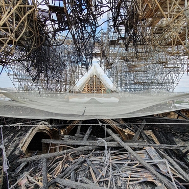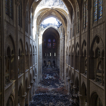 Au soir de l’incendie qui a embrasé Notre-Dame, l’effondrement de la charpente entraîne la chute de la flèche de Viollet-le-Duc, d’une partie des voûtes de la croisée et un arc doubleau de la nef. Plusieurs amas de décombres se forment alors au sol (partie orientale de la nef, bras nord du transept et la croisée), ainsi que sur les voûtes du chœur et de la nef. Parmi les matériaux enchevêtrés se trouvent de très nombreux blocs lapidaires de la croisée et de l'arc de la nef, d'importants amas de bois d'œuvre issus de la charpente et de la flèche, mais aussi des éléments métalliques provenant de la charpente et de la couverture (crêtes de faîtage, feuille de plomb, décors de fonte…).