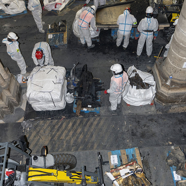 Parallèlement, dès juillet 2019, les très nombreux matériaux effondrés sur les voûtes des deux bras du transept (bois, charbons, éléments de toiture, cloches, fragments d’horloge…) sont eux aussi documentés et prélevés – cette fois-ci grâce à l’aide de cordistes – avant d’être triés et inventoriés dans les barnums sur le parvis.